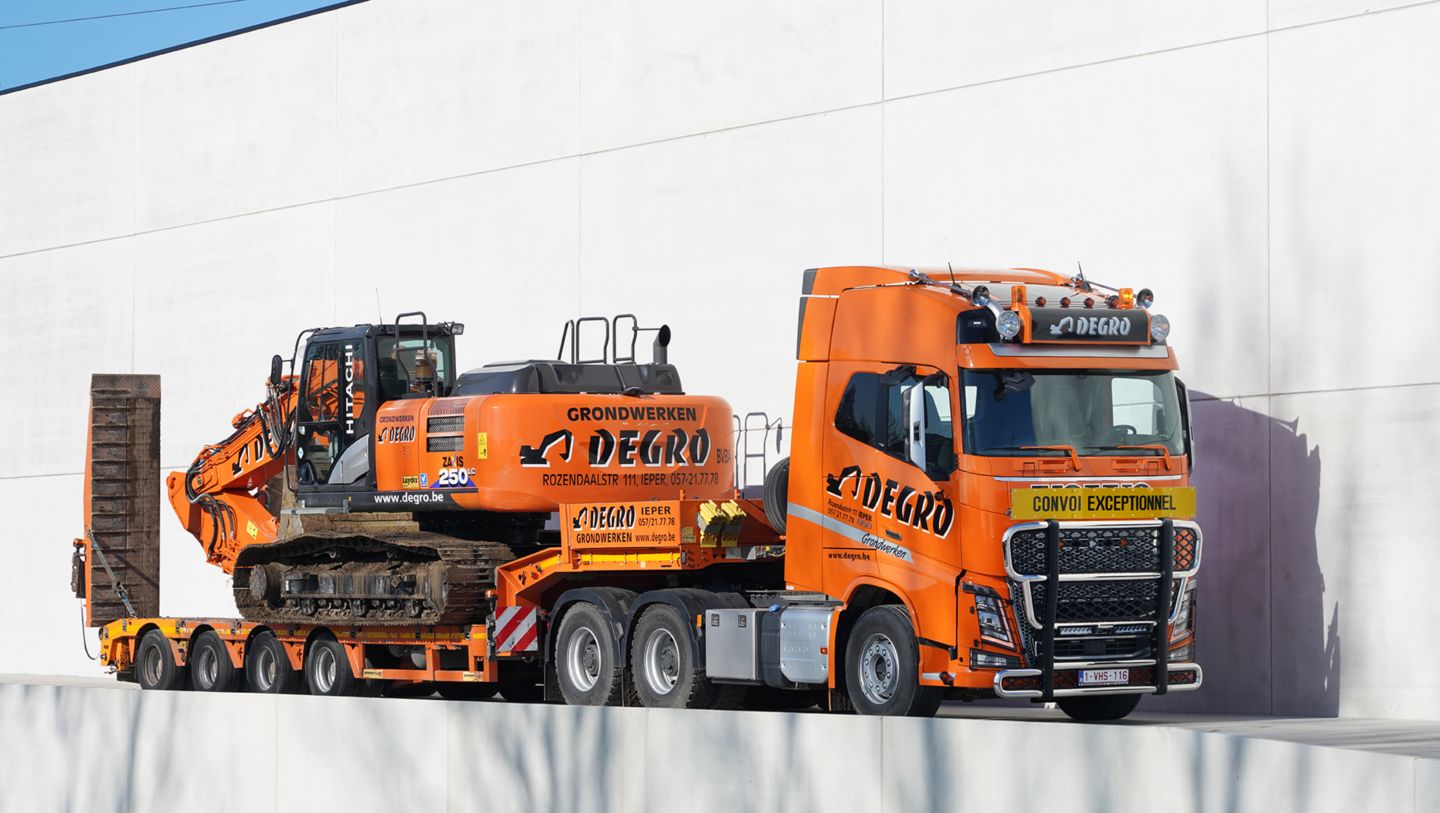 Chez Degro les tracteurs Volvo sont accouplés à des semi-remorques surbaissées pour déplacer les engins de chantier jusqu’à environ 55 tonnes. En fonction du travail, ces combinaisons peuvent également rouler avec un plateau doté d’une grue mobile ou avec une benne basculante. « Pour le transport de machines plus lourdes, nous faisons appel à Acturo. Comment pourrait-il en être autrement ? Nous ne sommes donc pas seulement partenaires à la ville », conclut Lode Desot.