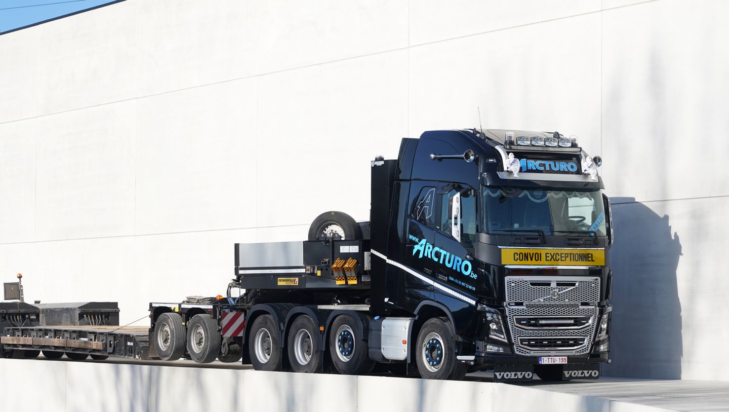 Arcturo dispose de plusieurs remorques surbaissées à 4 ou 5 essieux oscillants (configuration large ou étroite), à l’avant desquelles peut être accouplé un Interdolly à 2 ou 3 essieux. Ces remorques sont tractées par trois tridems Volvo FH16-750 8x4. L’entreprise possède, en outre, des semi-remorques surbaissées et une double remorque extensible jusqu’à 30 mètres, tractée par un tandem Volvo FH16-540. Si la masse à vide de ces combinaisons lourdes avoisine les 48 tonnes, il reste néanmoins suffisamment de charge utile pour transporter des machines lourdes. Une bonne préparation de l’itinéraire, des papiers et des permis nécessaires est évidemment essentielle. « Il n’y a peut-être pas de véritables montagnes en Belgique, mais le pays comporte tout de même quelques collines escarpées, que les combinaisons (pouvant peser jusqu’à 140 tonnes au